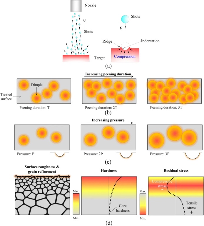 图6.示意图描述了(a)喷丸强化(SP)。(b)强化持续时间和(c)目标表面压力增加显示了喷丸强化处理的效果。(d)从左到右,SP处理的常见效果包括增加表面粗糙度、诱导表层晶粒细化、硬化和诱导压缩残余应力。