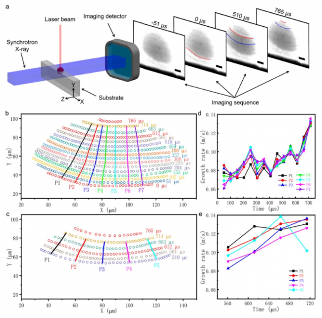 图2 304L SS液滴快速凝固过程中双固液界面的高速同步x射线成像定量研究。(a)全液态球形液滴快速凝固过程中的高速同步加速器x射线成像示意图。代表性的x射线图像显示了激光熔化液滴双固液界面的演变。比例尺尺寸为20µm。(b)球形液滴冷却时初固液界面的演变。以可检测凝固峰的外观为参照点。根据凝固前沿的法向生长方向计算了七个点的运动轨迹,跟踪了整个凝固寿命。(c)第一次凝固峰后第二次移动边界的演变。跟踪五个点来量化移动轨迹。(d)七个追踪地点在主要固液界面随时间的增长率。(e)五个跟踪地点在第二次移动的固液界面上随时间的增长率。