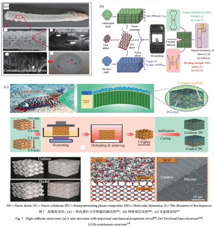 高刚度仿生结构具有较高的强度和韧性及抗疲劳性,这使他们适用于航空航天、交通运输等对质量敏感的行业。但是其复杂的结构设计可能会导致制造成本的增加,且结构在层间耦合较差时,其性能可能会受到影响。最后这些仿生结构的性能也会受所使用材料性能的限制,因此还要选择合适的材料才能实现结构的高刚度。