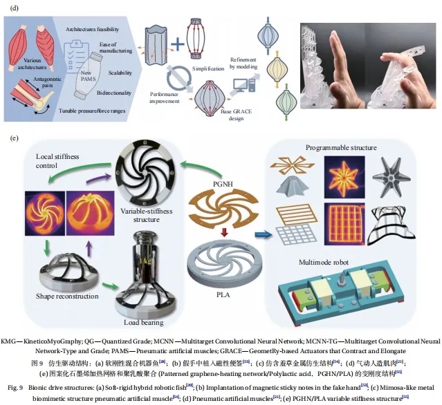 气动是在气体压力的作用下,结构发生扩张和收缩来实现运动。人体肌肉的收缩和扩张,涉及的结构形状变化可以通过气动来实现。De Pascali等[21]提出了一类气动人造肌肉(图9(d))来模仿生物肌肉的收紧和拉长,从而实现复杂、逼真的运动。该结构利用3D打印技术由不同材料在不同尺度上制造,实现了在复杂设备中的无缝集成,从而实现复杂的多样化运动。Wang等[55]选择具有热塑性的聚乳酸PLA为变刚度材料,利用激光雕刻机将石墨烯薄膜加工成图案化石墨烯加热网格(Patterned graphene-heating network,PGHN),然后将其与3D-PLA的目标加热位置键合,形成PGHN/PLA变刚度结构(图9(e))。这种结构可以对其任意位置实现加热,从而实现局部刚度控制,王等再用这种机制设计了一种气动机器人,该机器人基于PGHN/PLA变刚度结构的局部刚度控制和形状锁定功能,能够实现了单气源下的双向运动控制。