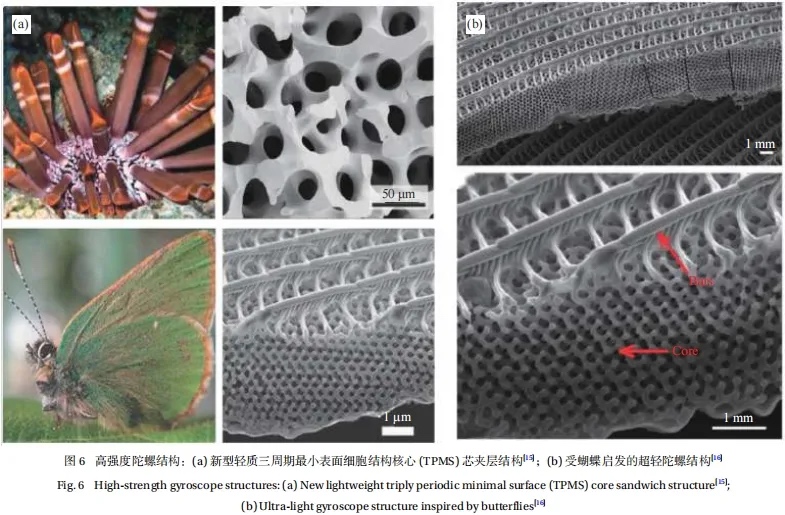蝴蝶翅膀是一种由多种成分组成的多尺度异构多孔陀螺杂化结构。从力学角度看,蝴蝶翅膀是一种针对弯曲荷载进行优化后的结构,其高度多孔的中心区域将两个外部区域分开,承重杆通过垂直的较小杆连接到多孔核心(图6(b))。这种内部多孔区域的拓扑结构不仅使结构的刚度最大化,还能使其质量最小化。Pelanconi和Ortona[16]通过观察蝴蝶翅膀的鳞片设计出一种超轻陀螺结构(图6(b)),并采用立体光刻3D打印技术将塑料部件打印成主体结构,并将碳纤维增强筋取代肋骨连接到主体结构。弯曲试验结果表明碳纤维加固后的结构的最大承受荷载比未加固结构提高了180%。