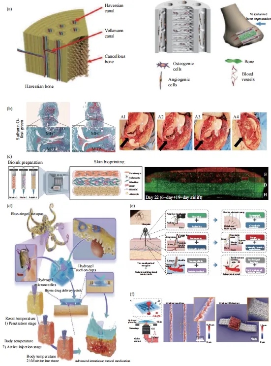 微针仿真是一种利用生物启发的方法来设计和制作的微针贴片,以实现在湿环境中的组织表面黏附和有效的药物传递,实现组织内局部用药。受蓝环章鱼捕食时通过牙齿将毒液注射入猎物这一机制启发,Zhu等[22]通过间接3D打印技术制备活性注射微针(图10(d)),设计了具有优异黏附能力和穿透软组织或黏液屏障能力的微针贴片,实现组织内局部用药时的表面屏障穿透和可控药物递送。与传统药物传递方式相比,其具有更强的组织渗透能力、更有效的组织表面附着、控制药物释放、更好的生物安全性、更好的医疗效果等优势。