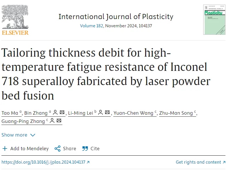 相关研究以“Tailoring thickness debit for high-temperature fatigue resistance of Inconel 718 superalloy fabricated by laser powder bed fusion”为题,在International Journal of Plasticity 182 (2024) 104137上进行了详细报道。论文第一作者为东北大学博士研究生马涛,通讯作者为东北大学张滨教授、太行实验室雷力明研究员和中国科学院金属研究所张广平研究员。