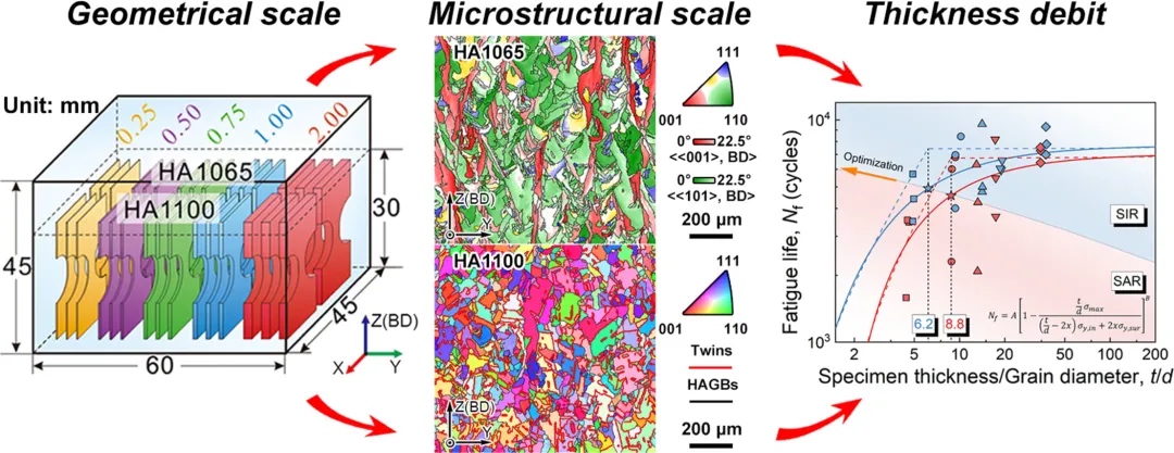 近期,东北大学材料科学与工程学院张滨教授团队与中国科学院金属研究所、太行实验室合作,以激光粉末床熔融(Laser powder bed fusion,LPBF)成形Inconel718合金为研究对象,考察了薄壁试样厚度(0.25 mm~2.0 mm)和均匀化温度(1065℃和1100℃)对LPBF成形合金650℃下疲劳性能的影响。研究发现,具有相同微观组织尺度薄壁试样的疲劳寿命随着试样厚度与晶粒尺寸之比(t/d)的减小而缩短;1100℃均匀化处理的薄壁试样疲劳寿命高于1065℃处理的试样。基于连续损伤力学及位错理论,建立了描述试样厚度与组织尺度对薄壁构件疲劳寿命耦合影响的理论模型,并据此获得了LPBF成形Inconel 718薄壁构件650℃疲劳寿命稳定性的t/d边界条件;同时,提出了通过调控热处理工艺有效减轻LPBF成形薄壁构件高温疲劳性能对构件尺寸敏感性的策略。