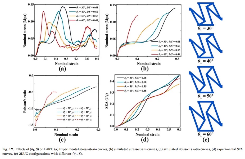 3.参数a、θ1和S通过改变单元格的非对称配置共同影响LART的力学性能,而θ2通过改变三角形的旋转角度来调节LART的力学性能。参数对LART的影响主要体现在第一次平台阶段的长度和强度、EM、峰值应力的大小以及达到峰值应力的速度上。通过设计这些参数,LART可以具有适应不同工程应用场景的特性。