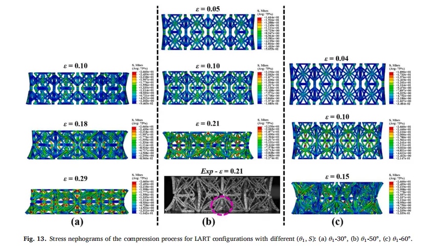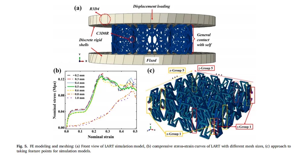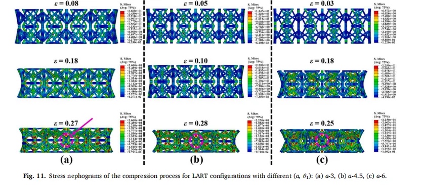 通过实验和有限元 (FE) 模拟相结合的方式,研究了 LART 在准静态压缩下的破碎响应以及结构参数对力学性能的影响。结果表明,LART 具有明显的 NPR 性能,并且可以通过改变参数来调节 LART 的力学性能。此外,还使用 FE 模拟研究了壁厚和单元数量对 LART 的影响。最后,将 LART 与 2D-ART 和 3D 重入晶格结构 (3D-RE) 进行了比较,以突出设计优势。