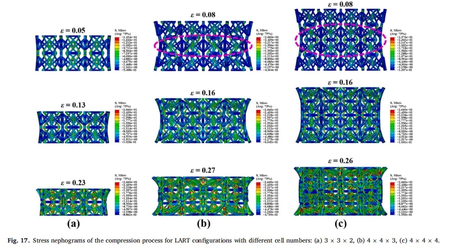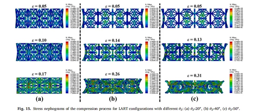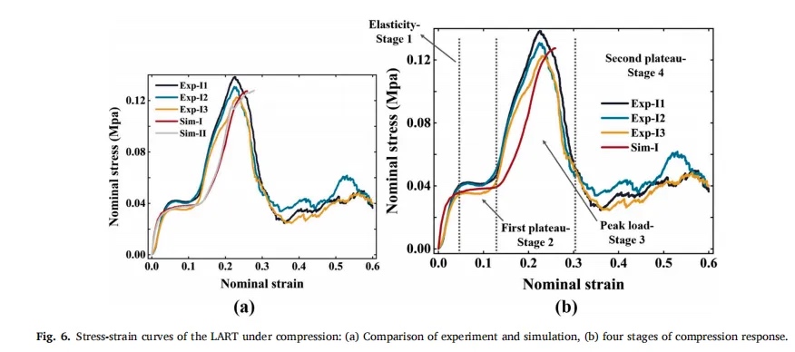 1.LART的应力曲线可以分为四个阶段:弹性阶段、第一次平台阶段、峰值应力阶段和第二次平台阶段。由于材料本身脆性,LART在第二个平台阶段发生了严重的断裂失效,表现出类似于突然屈曲的承载特性。在峰值应力之前,LART的压碎响应可以通过理想的弹塑性材料模型很好地模拟,有助于研究结构的连续变形模式和泊松比。
