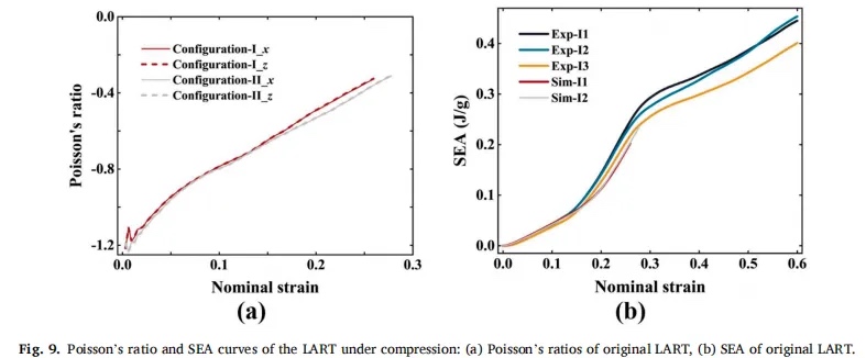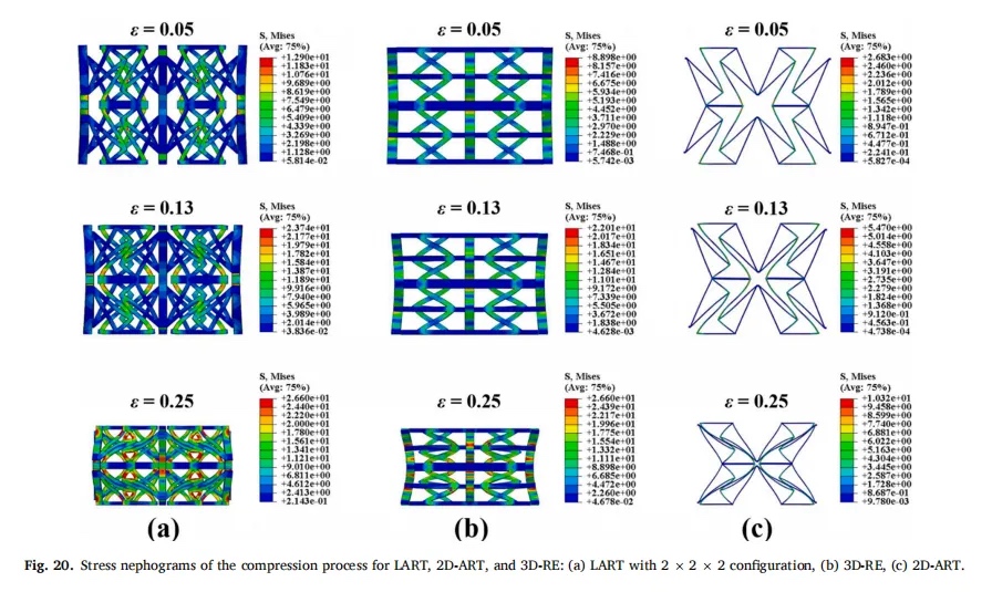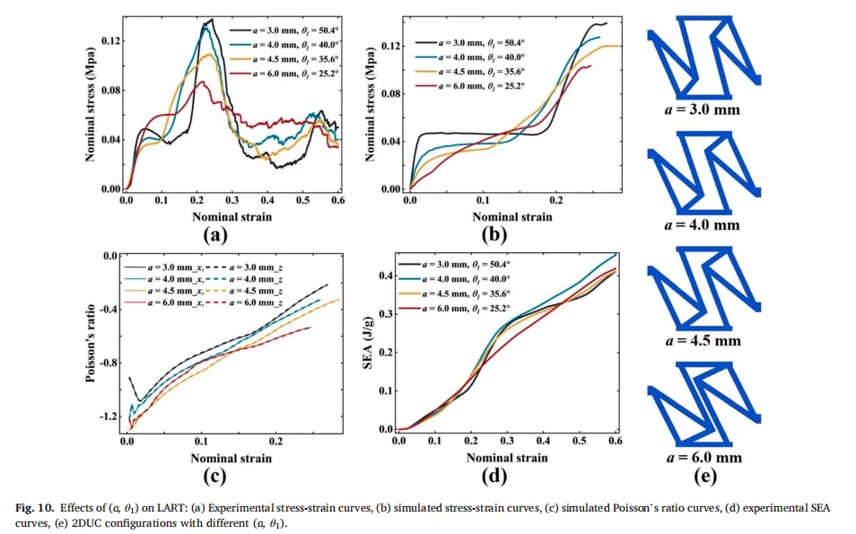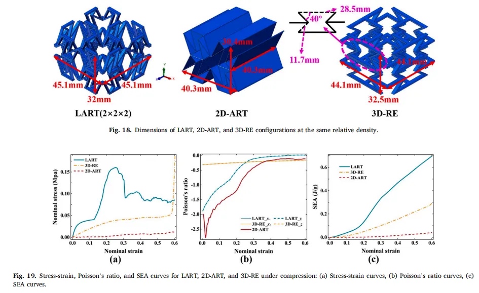 结果表明,LART 具有优于其他两种结构的承载能力,比能量吸收 (SEA) 值分别是 2D-ART 和 3D-RE 的 17 倍和 2.34 倍。本文研究的 LART 构型均未出现单侧屈曲的不稳定变形,证明了其在软机器人和电子设备等领域的潜在应用。