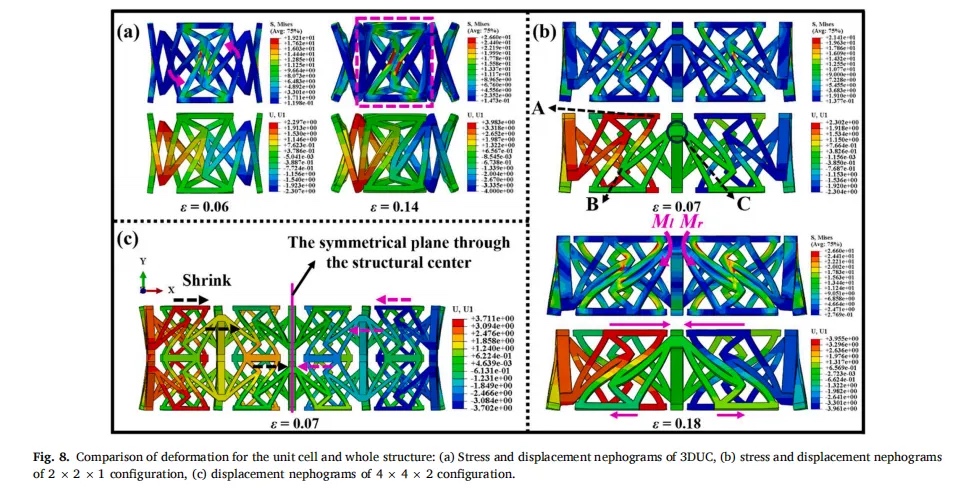 2.随着压缩的进行,LART从外围向结构中心收缩,表现出沙漏形状的变形,并展现出优异的自膨胀特性。当沿y方向压缩时,由于对称性,LART的泊松比在x和z方向上几乎相同。连接方式的改变使得LART的单元格不再表现出与原设计策略相同的变形机制,不同的镜像方法对LART的力学性能几乎没有影响。