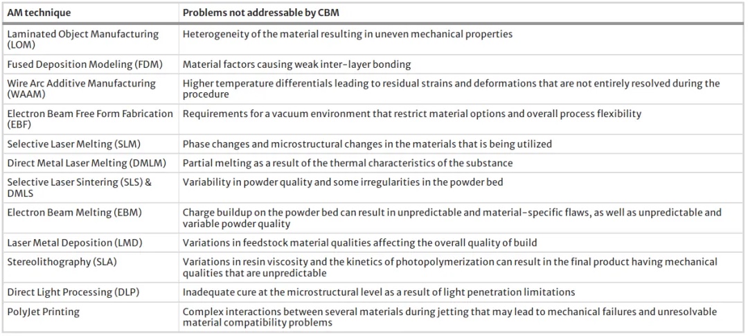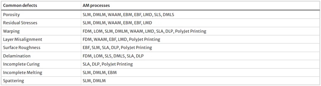 表1概述了CBM技术的局限性,重点是在每种AM工艺中无法检测到的缺陷。表2是本文的总体摘要,详细介绍了每种AM技术、与之相关的常见缺陷以及适合检测这些缺陷的CBM技术。表3列出了常见缺陷,并指明了每种缺陷出现频率最高的AM技术。
