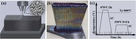 图1所示。(a) led工艺示意图;(b)堆积的大块;(c)不同时效时间的热处理制度示意图。