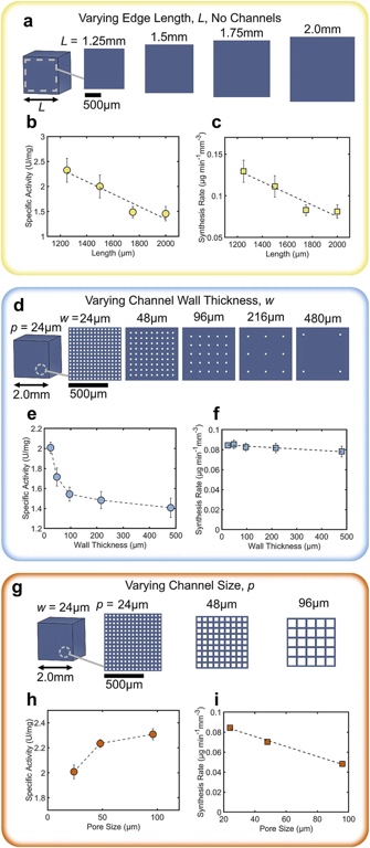 基于上述现象,为进一步改善反应物扩散和酶可及性问题,团队尝试在反应器核心中设计通道。初步固定通道宽度为24 μm,改变反应器核心的壁厚度(24 μm - 480 μm),观察到壁厚从480 μm减小到24 μm时,比活性提高约40%,其中壁厚度小于100 μm 时提升尤为显著。而这一尺度是传统3D打印难以实现的,再次证明PμSL技术运用于该类结构的生产优势。实验观察到合成速率并未随壁厚度减小而显著增加,这是因为减小壁厚度虽缩短了扩散路径提高了合成速率,但也减少了酶的总质量,二者存在权衡关系。进一步的研究表明,固定壁厚度为24 μm,改变通道宽度(24 μm- 96 μm)时,比活性增加15%,原因是较大通道利于热对流,使底物更快到达水凝胶中心,从而增加了底物与酶的接触机会。然而,合成速率却下降了43%,主要原因为通道尺寸增大导致打印水凝胶体积减小,进而使得酶质量随之减少。