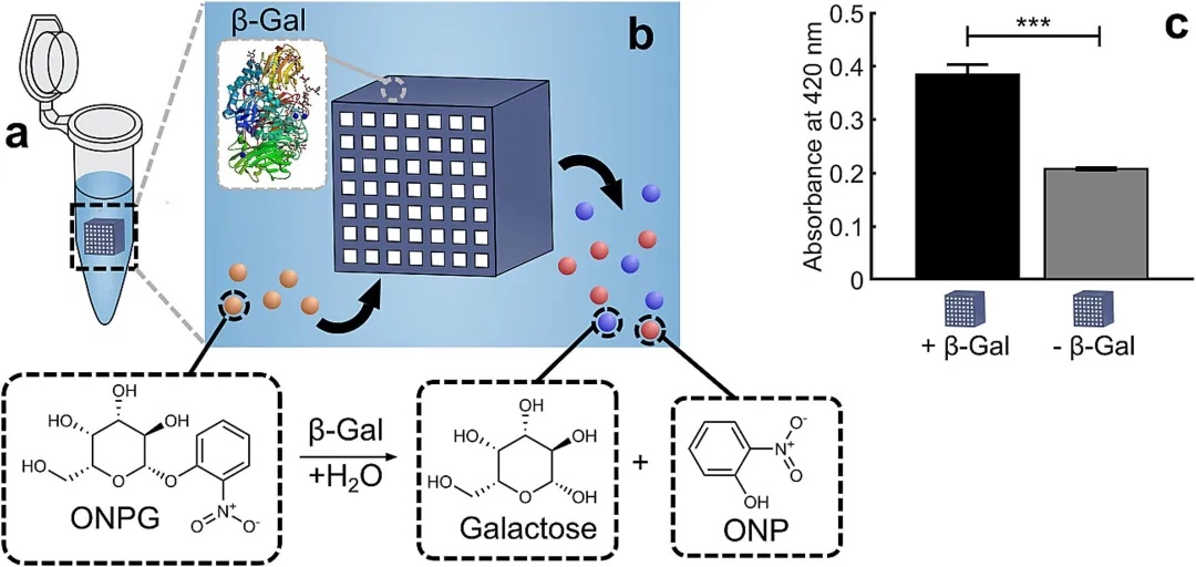 实验表明,β-半乳糖苷酶在未固化的聚乙二醇二丙烯酸酯中暴露160分钟后,仍能保留80±10%的活性。同时,通过测量打印件浸泡在缓冲液中上清液的活性发现,β-Gal被水凝胶包裹后几乎没有渗出,这进一步证明了该方法的有效性。