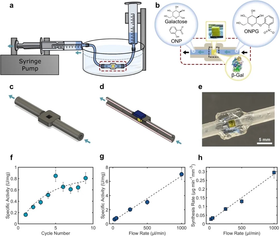 接下来,团队设计并打印了一套完整的连续流反应器。组装完成后,研究人员先以50 μL/min 的流速将500 μL反应物溶液注入反应器,并重复9次循环。实验初期,由于反应器需要时间建立稳定的反应物和产物流动状态,输出的比活性较低(0.16 μmol·min-1·mg-1)。但随着循环次数的增加,反应器逐渐达到稳态,比活性也逐渐升高,最终达到约0.8 μmol·min-1·mg-1并趋于稳定。