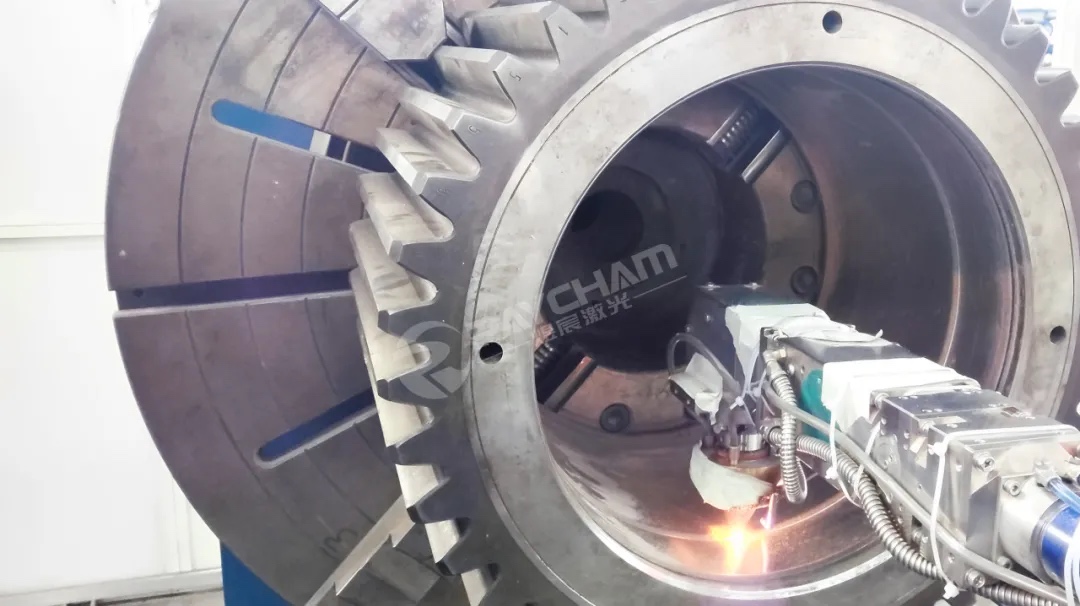 针对行星齿轮内壁划伤深度0.5-1mm、平均硬度55HRC的修复需求,采用机器人+转盘激光熔覆加工平台实施精准修复。通过配备内孔熔覆激光加工头,以螺旋线轨迹对磨损区域进行熔覆覆盖,同时对油孔采用封堵预处理技术。选择FeCr合金粉体材料进行单层熔覆1.5mm,在保证耐磨性提升的同时维持齿轮抗冲击性能。