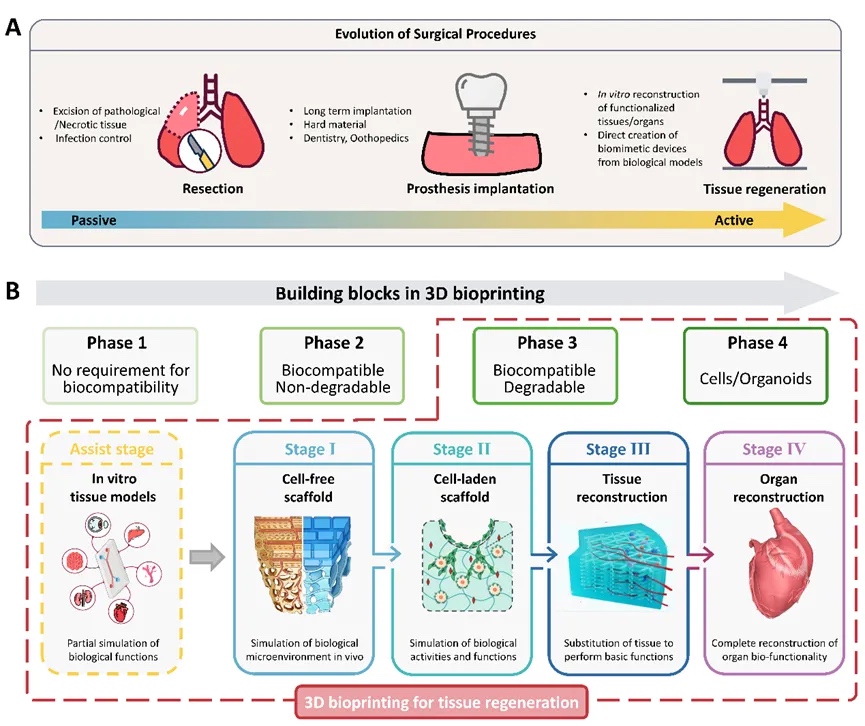 此外,这一技术演变还涵盖一个辅助阶段:即利用器官芯片或类器官的体外组织模型来模拟生物功能,从而促进对生理过程的更深入理解并优化组织再生策略。