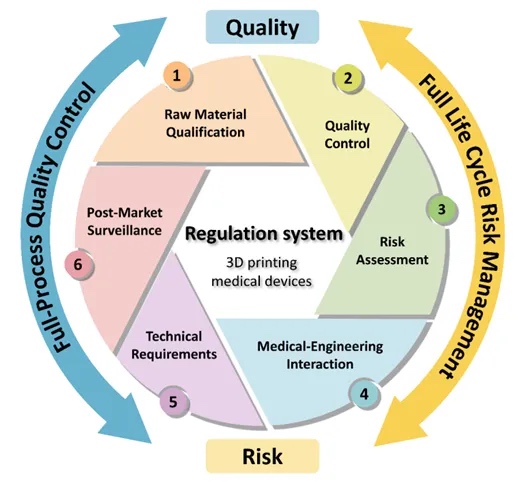在中国,当前批准用于医疗3D打印的材料主要局限于钛、钽等无机不可降解材料。这类材料惰性强,监管审批相对简易。然而,这类材料主要通过机械嵌合的方式与组织结合,但并不牢固,且容易引发炎症、过敏等不良反应。因此,未来的发展趋势将倾向于探索和开发面向组织再生的可降解材料。尽管研究者们期望放宽监管政策以加速研究进程,但从监管角度而言,必须全面评估可降解人工植入物在体内的降解过程、代谢产物以及与宿主组织的相互作用,才能确保全生命周期行为的安全性。因此对于从研究到临床应用的转化过程,采取多阶段、渐进式的开发策略可能更为实用。例如,在3D打印医疗产品的生产中,可以优先考虑那些已经广泛应用于临床或仅需简单修改即可使用的材料。然而,从长远的角度来看,可降解材料、载药材料以及载生物制剂材料将成为未来研究的重点领域,对于推动医疗3D打印技术的发展具有重要意义。