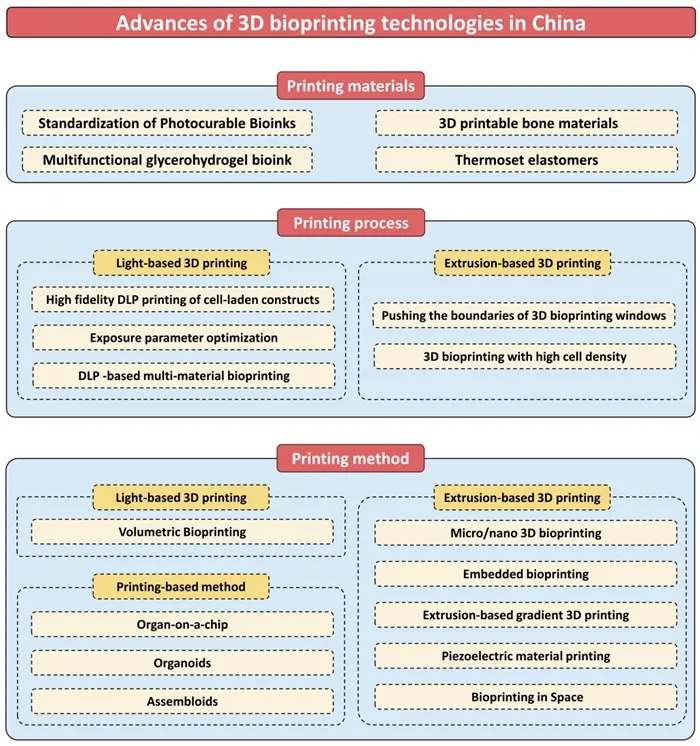 中国研究团队在3D生物打印技术方面取得了显著进展。在打印材料方面,推进了光固化墨水的标准化,开发了用于3D打印的可降解骨材料,多功能甘油水凝胶以及热固性弹性体等新型打印材料,为生物医学工程领域提供了更安全、更高效的材料解决方案。在打印工艺方面,研究工作主要聚焦在两条核心技术路径上:光固化打印和挤出式打印。光固化打印在高精度和多材料生物打印方面取得了显著进展,为复杂生物结构的精确构建开辟了新途径。同时,挤出式打印在优化打印窗口和实现高细胞密度打印方面也取得了重大进展,进一步增强了生物打印的功能性。在打印方法的探索中,研究团队对体积打印、微纳打印、嵌入式打印、梯度打印、压电材料打印和太空打印等一系列关键技术进行了深入研究。不仅扩大了3D生物打印的应用范围,还为未来的生物医学研究和临床应用提供了更多的可能性。此外,中国的研究团队也致力于开发器官芯片和类器官技术,旨在通过高度仿生的生理环境模拟来加速疾病建模、药物筛选和再生医学研究。
