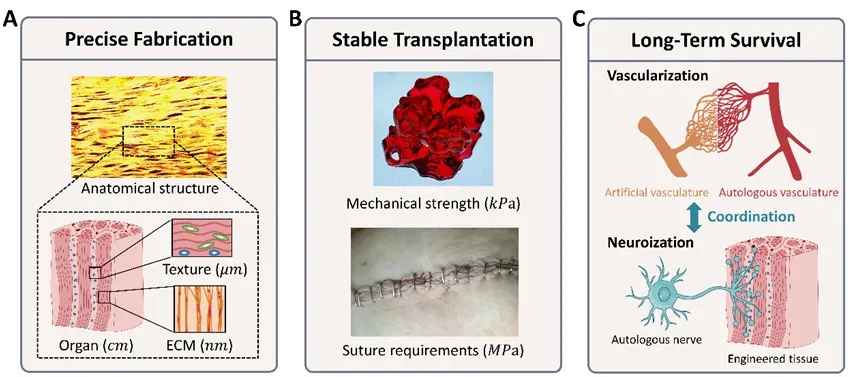 在器官再造的基础研究中,神经化及血管化的成功构建是一个关键节点,它对于保障大尺寸工程组织的活性至关重要,也是生物组织功能化的基本前提。然而,自然组织内部的毛细血管网络以及神经末梢通常为微米尺度,而器官的整体尺寸要达到分米及以上尺度,这一由微观至宏观的跨尺度精确构造过程,对制造技术提出了极高的要求。