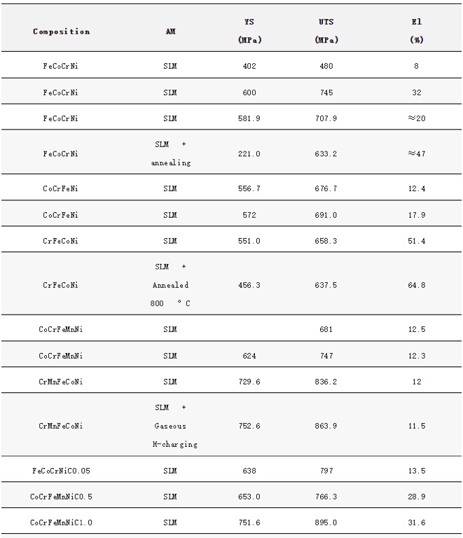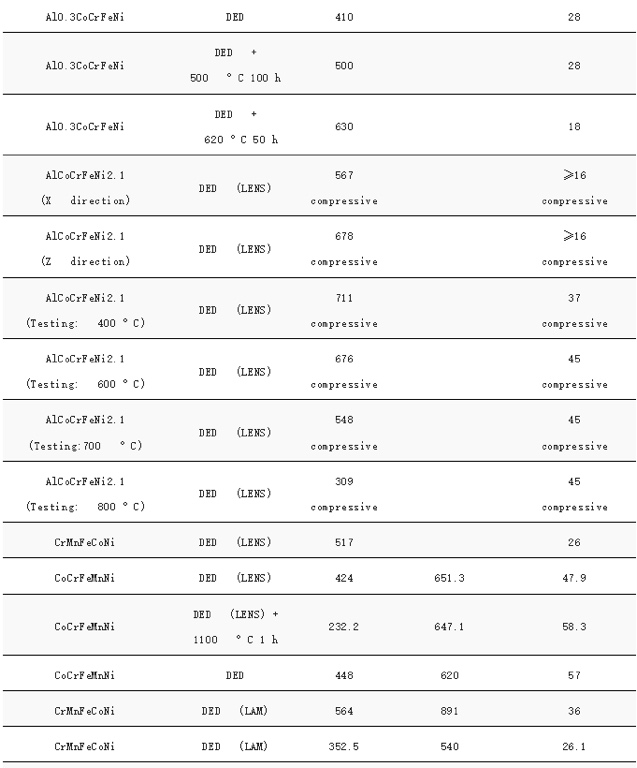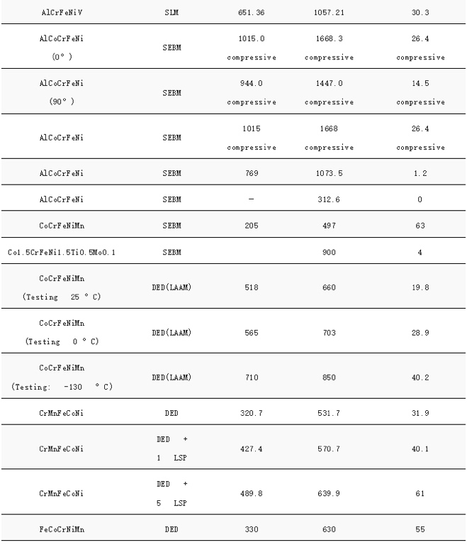 图7显示了AM加工的HEA的压缩和拉伸实验获得的强度和延展性,具体合金成分和性能列于表1中。比较SLM和DED生产的HEA的性能,可以观察到SLM加工的HEA通常比DED制造的HEA具有更高的强度。相比之下,BJT生产的HEA具有最低的抗拉强度,尽管它们的抗压强度相对较高。