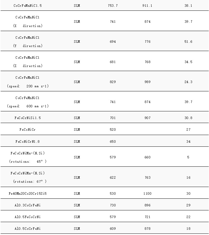 D.Lin等人使用SLM合成了Si含量为1.5at.%的FeCoCrNi HEA,揭示了单相FCC固溶体的柱状晶粒,没有形成第二相。其强拉伸性能归因于固溶和位错强化。