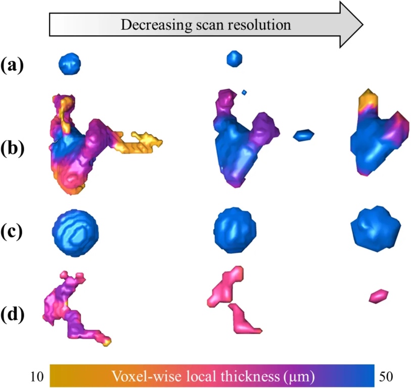 XCT用户常面临高分辨率/慢速扫描与低分辨率/快速扫描的选择,每种方式各有优劣:高分辨率扫描(体素大小通常在3到5微米之间)对检测微小缺陷至关重要,尤其是在航空航天和医疗领域,零件失效可能导致严重后果。然而,这种扫描耗时较长,不适合大批量零件检测。中等分辨率扫描(体素大小在6至10微米之间)在缺陷可见度和扫描速度之间提供了平衡,适用于一般工业应用,这些场景下分辨率的适度降低不会显著影响性能。低分辨率扫描(体素大小超过10微米)适合快速检测大型或高产量组件。虽然能有效识别较大缺陷(如锁孔和气孔),但可能遗漏较小或不规则形状的缺陷,导致对零件完整性的评估过于乐观,增加使用中的故障风险。