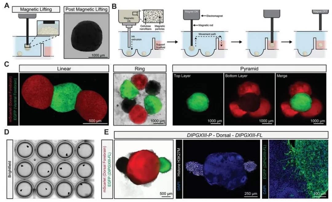 6. 3D打印用于神经类器官的发展。图7展示了磁增强神经类器官的过程和空间图案化器官转移平台,明亮场和免疫荧光染色图像展示了神经形态类器官和弥漫性桥脑胶质瘤类器官的融合及组装情况,体现了3D打印可精准操控神经类器官的构建。