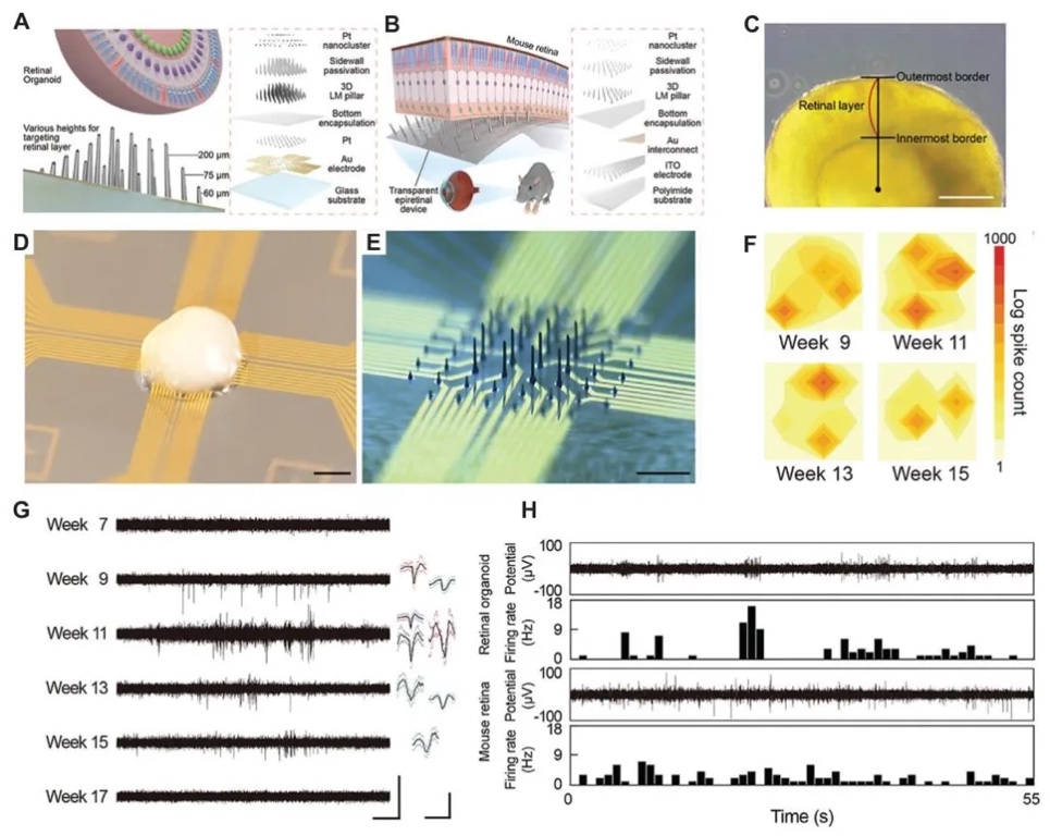 7. 利用3D打印监测视网膜类器官发育的情况。图8呈现了带有3D液态金属电极的微电极阵列和3D前视网膜膜装置,图像展示了人视网膜类器官中的视网膜层、放置在微电极阵列上的视网膜类器官等。还有放电率变化和单个单位活动的图表,能精准监测视网膜类器官发育过程中的电生理信号。