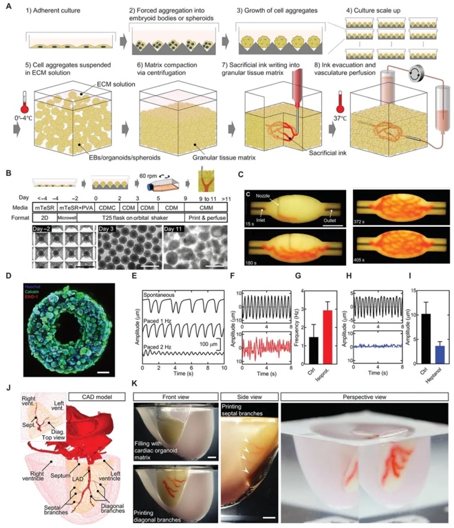 4. 通过3D打印实现类器官血管化的过程和效果。图5展示了“牺牲性写入功能组织”的流程,从细胞培养、聚合到构建血管网络。心脏类器官的设计图、3D打印的分支血管网络、灌注后心脏组织的细胞活力、收缩和电刺激反应等图像,表明3D打印可制造出具有灌注功能血管的心脏类器官,促进其功能发育。