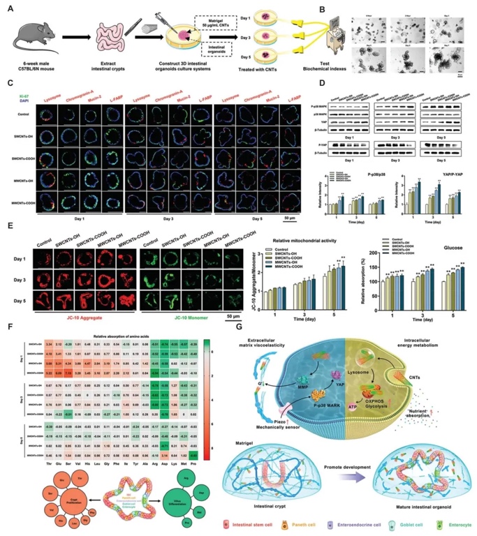 5. 碳纳米管对肠道类器官增殖和分化的影响。实验过程图像显示用碳纳米管处理肠道类器官,光学图像呈现其随时间的发育情况。染色图像标记不同上皮细胞,Western blot分析相关蛋白表达,还有线粒体膜电位、氨基酸吸收热图等数据,表明碳纳米管能促进肠道类器官发育。