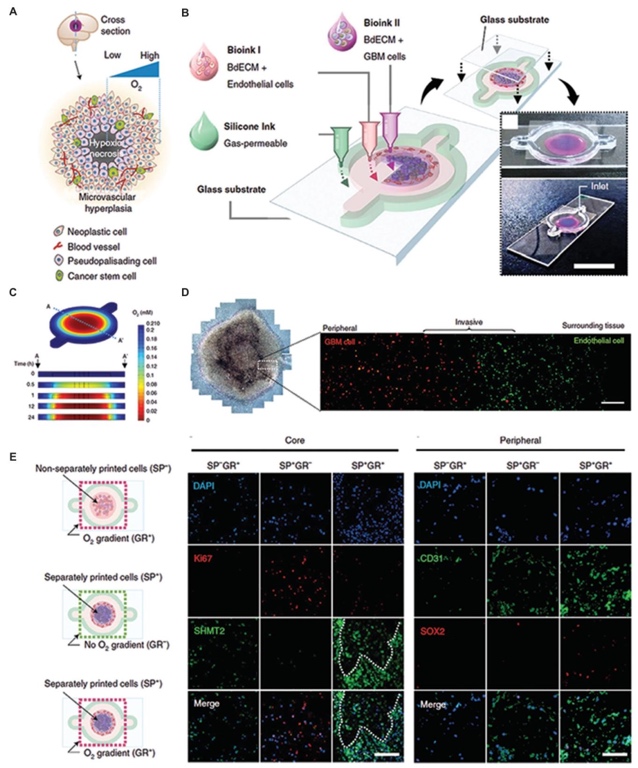 3. 肿瘤类器官的3D打印成果。以胶质母细胞瘤为例,图4展示了自然胶质母细胞瘤的微环境和结构,以及3D打印构建胶质母细胞瘤模型的过程。计算机模拟的氧浓度图像、显微镜观察图像和细胞染色图像,展示了打印构建的肿瘤类器官能模拟自然肿瘤的结构特性,如维持径向氧梯度,为肿瘤研究提供了有效模型。