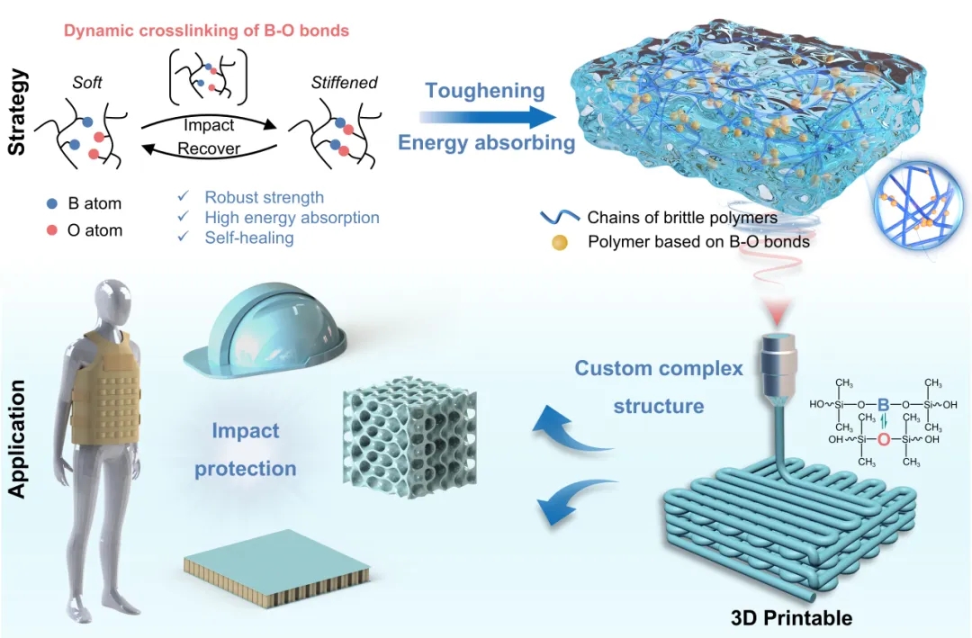 此外,研究团队受B-O动态配位键启发,提出了适用于3D打印聚合物基复合材料的通用增韧与能量耗散策略。通过剪切变硬材料SSG与聚乳酸基体的复合,成功制备了智能抗冲击复合材料PLA/SSG,在保持极限强度不变的前提下实现断裂延伸率40倍提升及330%冲击能量吸收率,兼具卓越抗冲击性、优异延展性及良好强度-延展性平衡。该材料同时具备出色的热稳定性与加工性能,适用于复杂结构的3D打印,其亚麻纤维增强复合材料的能量耗散较传统材料提升20.6%。该策略为3D打印智能抗冲击材料和结构的设计提供了新思路。相关研究成果“A Universal Toughening and Energy-Dissipating Strategy for Impact-Resistant 3D-Printed Composites”发表于综合类1区Top期刊Advanced Science。