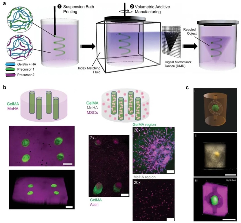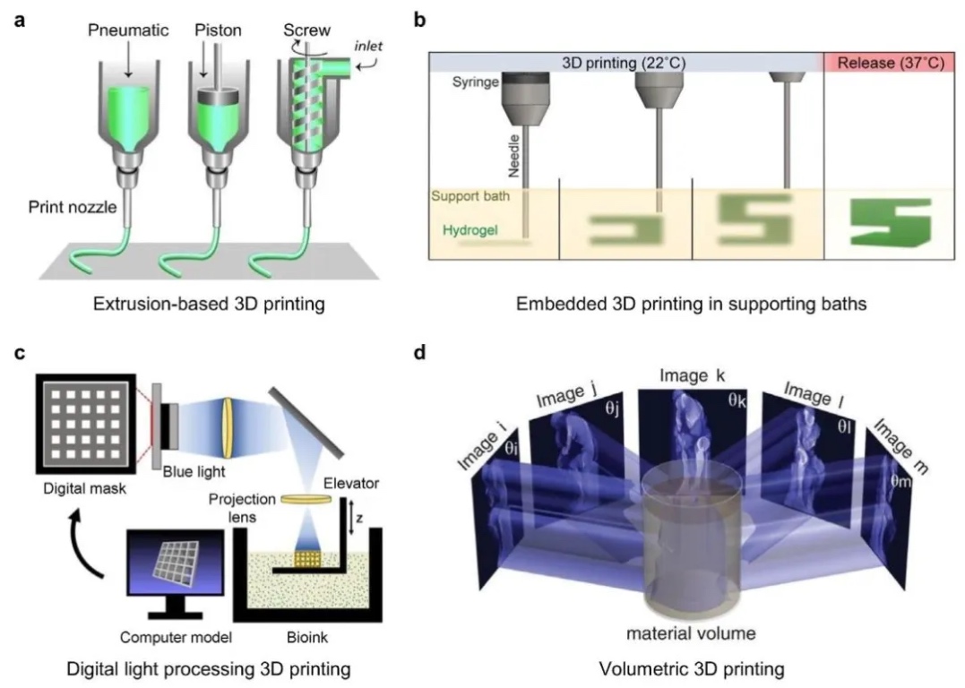 5. 体积3D生物打印。体积3D打印是新兴的基于光的打印技术,能同时生成整个3D物体,具有快速、可扩展等优点,但需大量生物墨水。体积生物打印(VBP)在此基础上发展而来,可与在支撑浴中嵌入式3D打印集成,制造多材料构建体。