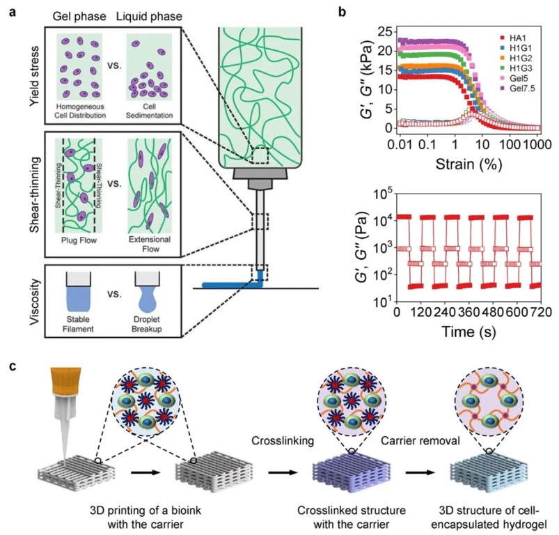 2. 挤出式3D生物打印。详细介绍挤出式3D打印过程,包括生物墨水从喷嘴挤出、沉积形成结构,以及打印后交联稳定结构。强调设计此类生物墨水面临的挑战,如平衡打印性与细胞兼容性的难题,引出具有剪切稀化和自愈合特性的凝胶相生物墨水这一解决方案,还介绍了通用生物墨水平台等策略。