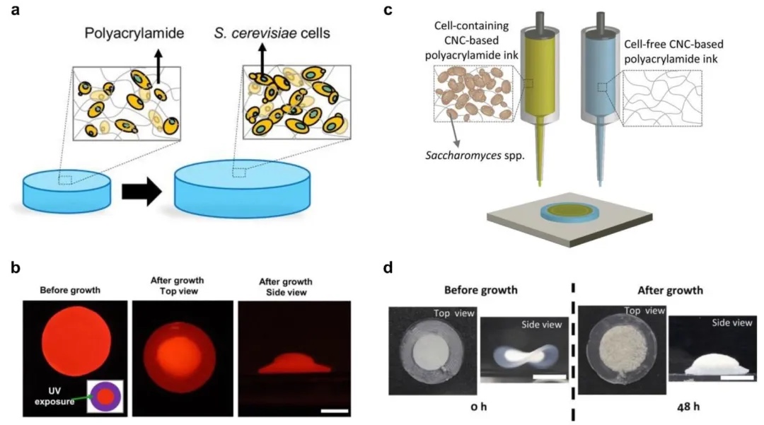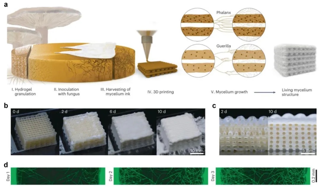 6. 3D打印活体构建体的打印后生长作为一种制造过程。以真菌菌丝体水凝胶的3D打印为例,说明将微生物生长纳入3D生物打印后,打印构建体可随时间生长和演化,菌丝生长能填充间隙、强化结构,还赋予构建体自我愈合能力。