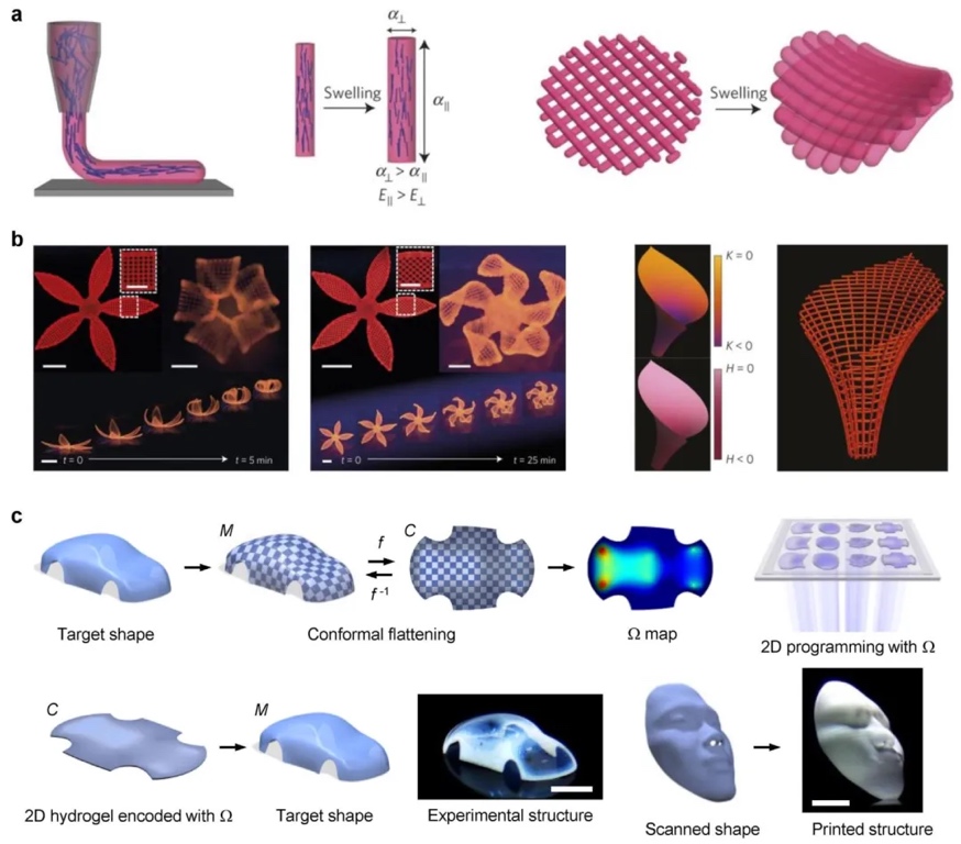 7. 形状变形材料与ELMs的3D生物打印的整合。介绍将形状变形材料与3D生物打印结合实现4D打印,可创建具有自适应和动态形态的活体构建体。展示了多种4D打印方法及在ELMs中的应用,如利用微生物细胞增殖实现形状变形。