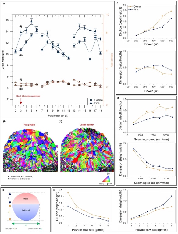 研究人员在该方法下,使用细粉获得粗晶或近单晶微观结构,使用粗粉获得近等轴细晶(<10 μm)微观结构。这种方法在不增加成本的情况下,对定向能沉积和粉末床熔合具有丰富的适应性,其中粉末流预热效 应和粉末床热物理性质决定了微观结构的变化。这项工作为利用原料粒度分布实现更可控、更具成本效益和可持续的金属增材制造提供了一条途径。3D 打印 SS316L 微观结构中粉末力度驱动的晶粒形态和尺寸控制