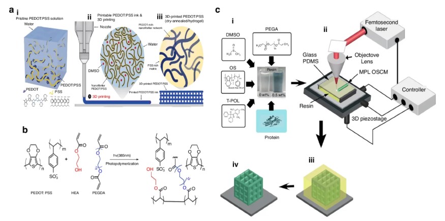 PEDOT:PSS 是一种常见的导电聚合物,它通过冻干法和在光固化基质中的再分散,被配制成高分辨率墨水。这些配方可用于创建神经探针和柔性电路的电极阵列。多光子光刻技术也已应用于从有机半导体树脂打印复杂的 3D 结构。