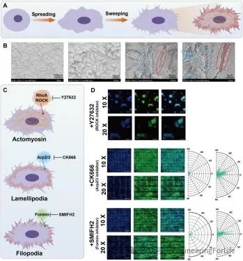 片状伪足(板足),作为细胞的“手掌”,是细胞迁移的主要驱动力。不能形成板足的细胞,其实现大范围运动的能力受损,导致各向同性排列。丝状伪足,作为细胞的“手指”,是感知ECM的特殊结构。如果没有足够的丝状足形成,细胞就会失去检测支架曲率差异的能力,从而导致沿X轴和Y轴的随机迁移和排列。