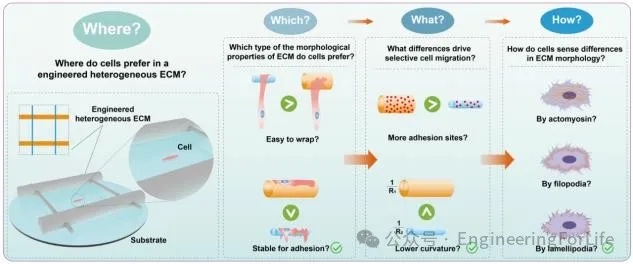 该研究主要从三个视角来阐明异质ECM与细胞的相互作用:①细胞更喜爱哪种形貌的ECM?②ECM中的哪种差异因素驱动了细胞的选择偏好?③细胞如何感知ECM的形貌差异?