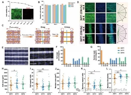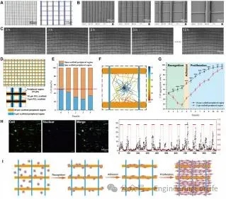 异质ECM中的细胞呈现各向异性排列,其方向与粗支架的方向一致。异质ECM内的细胞在播种后3小时内识别了不同的ECM,向粗纤维迁移并积累,最终粘附在粗纤维上。粘附在粗支架上的细胞自发地沿着支架轴线方向延伸。随后,贴壁细胞开始增殖,新细胞在原有细胞取向的基础上依旧沿支架轴线方向延伸,导致所有细胞定向排列并与粗支架的方向一致。