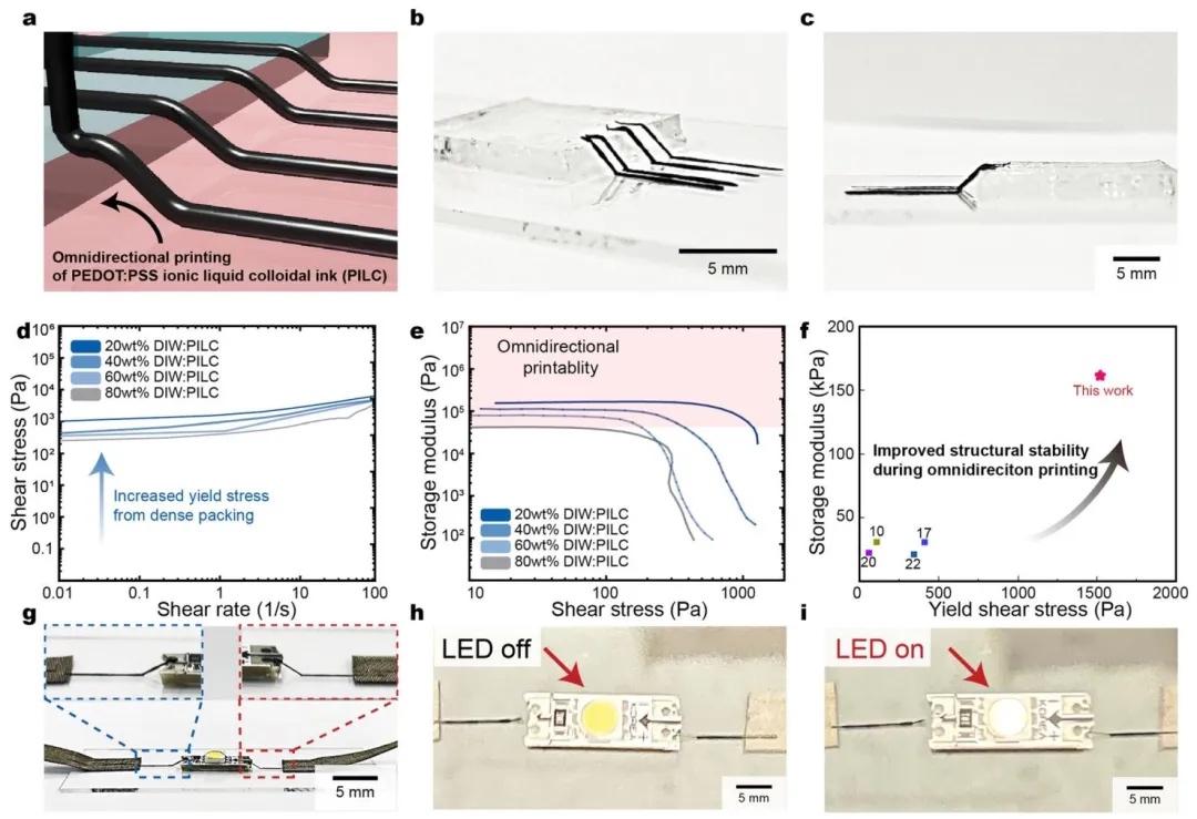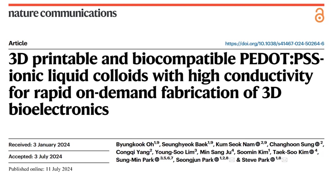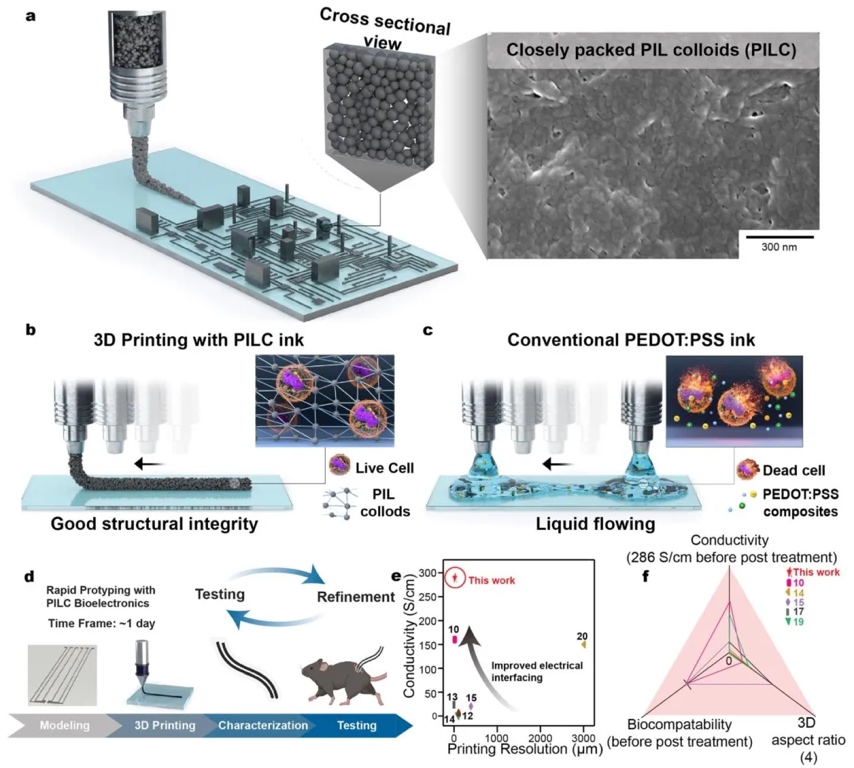韩国科学技术院(KAIST)的Seongjun Park教授与Steve Park教授团队合作,开发了一种离子液体辅助离心制备的PEDOT:PSS离子液体胶体油墨(PILC)。该团队通过离心诱导离子交换反应,形成紧密堆积的氢键网络胶体颗粒,无需后处理即可实现生物相容性,同时显著提升油墨的流变性能(储存模量达10⁵ Pa,屈服应力10³ Pa)和导电率(286 S/cm)。实验证明,PILC油墨可打印高分辨率(~50 µm)、高纵横比(4:1)结构及悬空架构,并直接用于体内神经信号记录(如海马区θ波振荡)和体外生理监测(ECG、EMG信号)。相关工作以《3D printable and biocompatible PEDOT:PSS ionic liquid colloids with high conductivity for rapid on-demand fabrication of 3D bioelectronics》为题发表在《Nature Communications》上。