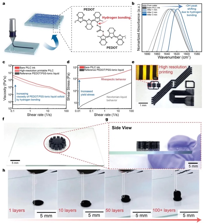 2. PILC油墨的流变性能与打印适性 利用流变仪测试油墨的剪切变稀行为和触变性,结合3D打印实验评估其结构完整性。结果显示,PILC油墨在低剪切速率下表现出高粘度(~1 MPa·s)和抗塌陷能力,可打印高纵横比(4:1)的垂直堆叠结构及2 mm悬空悬垂结构,打印分辨率达50 µm,优于传统PEDOT:PSS油墨。