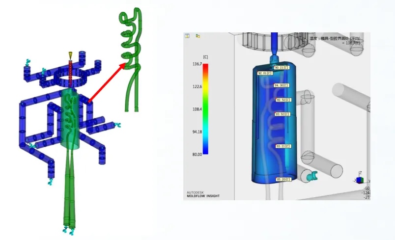 由42秒压缩到22秒,博世汽车电脑壳“三赢”。博世一款汽车 ECU(行车电脑)壳体为型腔结构,传统工艺下成型周期42秒,祝总团队通过随形冷却方案分析降至28秒,实际落地时通过前后模各配备专用模温机,最终成型周期压缩至 22 秒以内。这一成果实现 “三赢”:博世因周期缩短、成本降低而满意;荣科旭阳的直接客户(博世注塑供应商)因效率提升获得更多利润;荣科旭阳则凭借技术实力巩固合作 —— 该项目已顺利量产。
