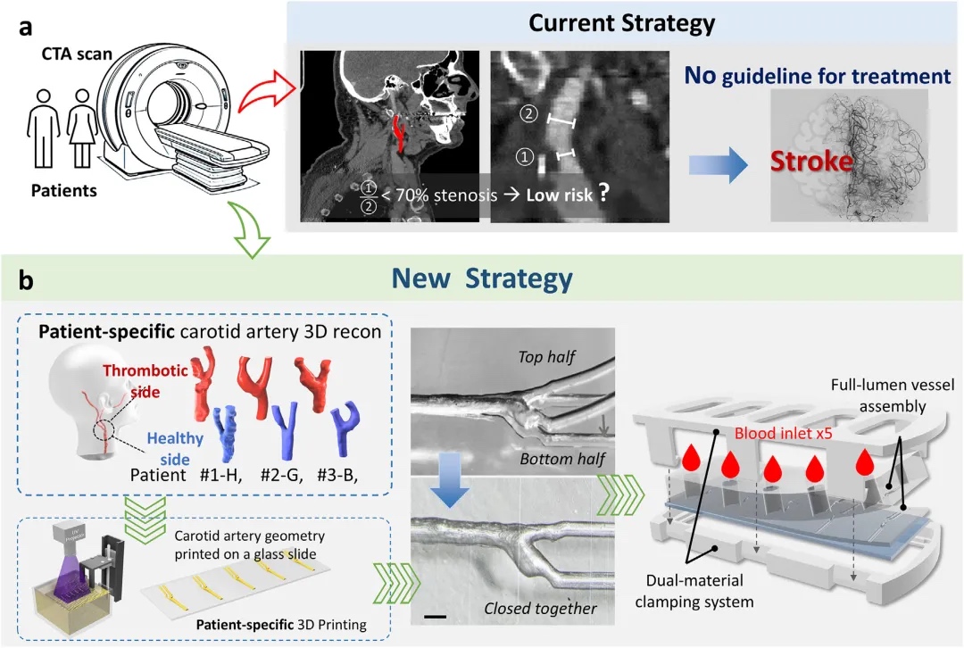 将患者特异性血管几何结构转化为功能性微流控设备,目前仍面临制造工艺上的技术瓶颈与制备周期过长的显著挑战。近期,悉尼大学居理宁(Arnold Ju)教授团队在国际顶级期刊《Advanced Materials》上发表了题为“Rapid Glass-Substrate Digital Light 3D Printing Enables Anatomically Accurate Stroke Patient-Specific Carotid Artery-on-Chips for Personalized Thrombosis Investigation”的创新型研究论文:依托摩方精密面投影微立体光刻(PμSL)技术,成功开发出超快速、自动化、患者特异性的血管芯片制造平台。该项研究将传统需要10小时以上的制造过程缩短至2小时以内,在制造精度、可靠性和应用范围方面实现显著突破。研究由博士生赵耘铎作为第一作者主导,王子豪博士作为第二作者参与关键技术开发。