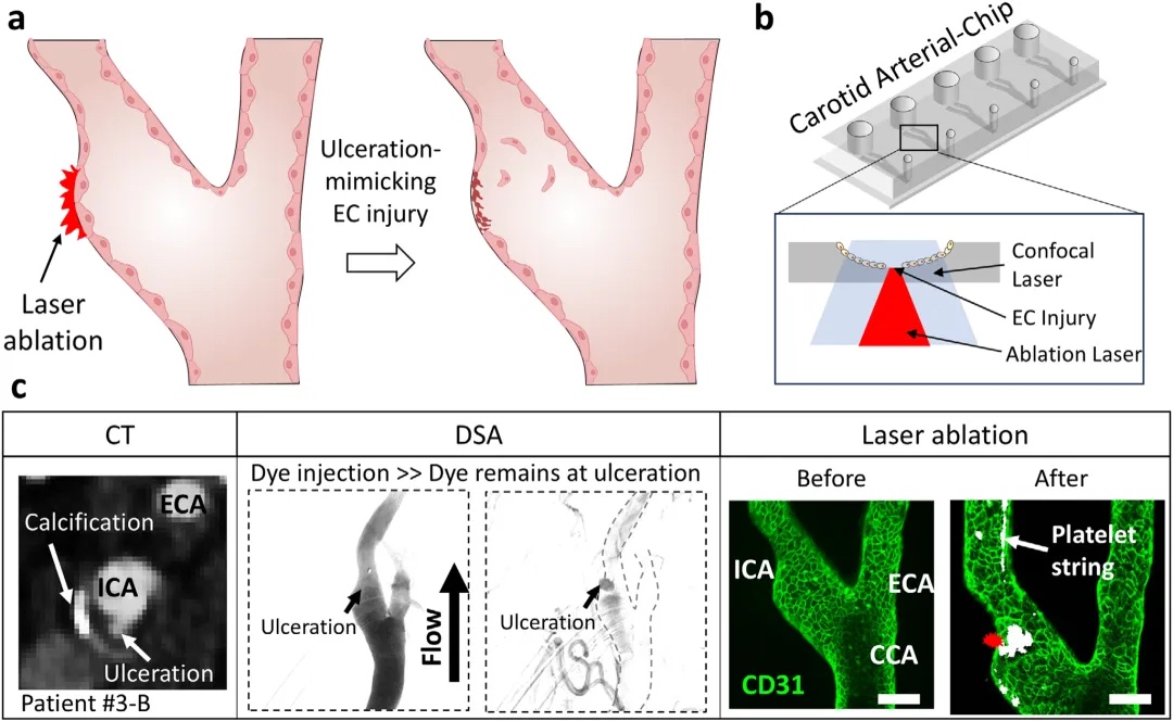 该制造平台不仅能够精准复制患者颈动脉的狭窄、分叉和溃疡等解剖特征,还支持内皮细胞培养和血流动力学模拟。通过计算流体力学验证,即使缩小30倍的芯片模型仍能保持与真实血管相似的血流剪切力分布,为血栓形成机制研究、药物筛选和个性化治疗方案制定提供了高度仿真的实验环境。此外,平台的标准化设计和模块化架构使其可扩展至冠状动脉、脑血管等多种血管疾病模型,满足了不同研究场景的需求。这项研究代表患者特异性器官芯片技术的重大进展,在个性化医疗和血管设备开发领域具有重要的应用价值,为研究剪切力依赖性血栓形成机制提供了新的工具。