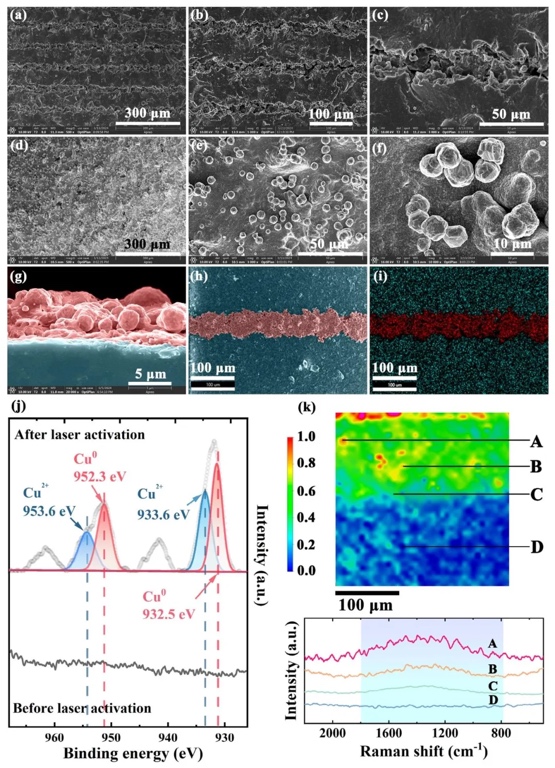 借助扫描电子显微镜(SEM)和X射线光电子能谱(XPS)等表征手段的研究方法,研究了激光激活后的树脂表面及化学镀铜层的微观结构。结果表明,激光处理使树脂表面形成规则沟槽,铜层呈现双层结构(底层连续铜层+顶层铜颗粒),且铜层与树脂基底的结合强度达到最高标准。
