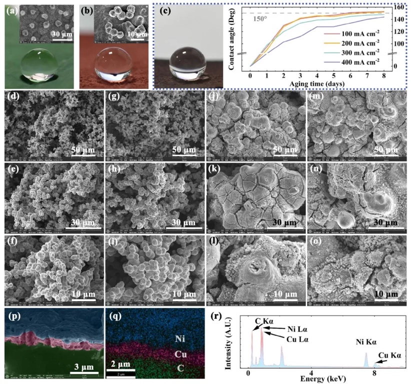 运用水接触角测量和SEM观察的研究方法,研究了铜层和镍铜层的超疏水性能及表面形貌。结果表明,铜层和镍铜层表面形成类似荷叶的微结构,水接触角分别达到152.3°和151.4°左右,具备优异的超疏水性,且镍铜层的磁性能随电镀电流密度变化而改变。