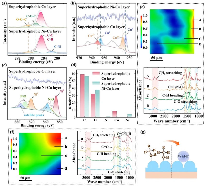 采用XPS和傅里叶变换红外光谱(FTIR)分析的研究方法,研究了超疏水金属层的表面化学组成。结果表明,金属层表面吸附空气中的挥发性有机物(VOCs),形成非极性碳氢化合物覆盖层,这是其超疏水性的化学成因。.