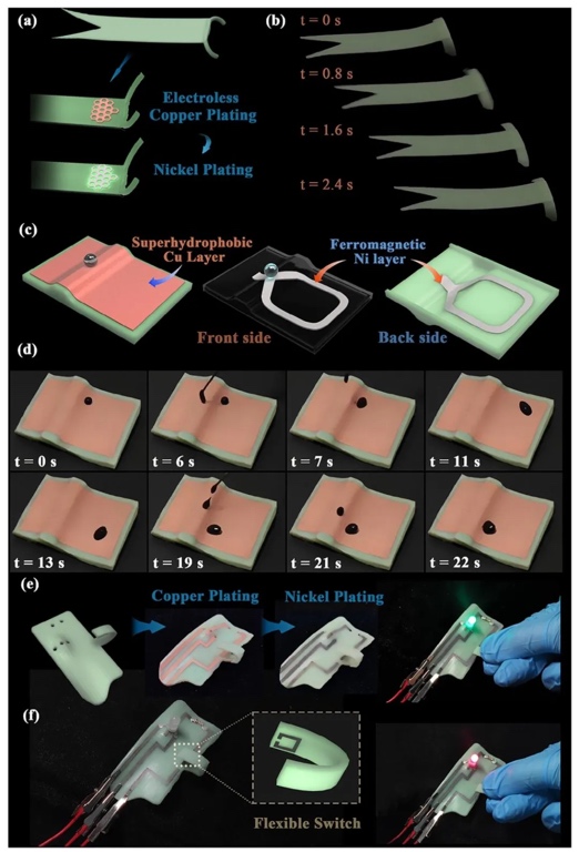 当前,3D打印柔性电子器件虽具备形状灵活及自定义3D结构以增强功能的优势,但传统方法如印刷导电油墨或多材料3D打印,存在导电层附着力差、制造复杂,且金属导电层易暴露空气中变质等问题。此外,实现导电材料精细图案化并确保与柔性基底紧密连接也是一大挑战。四川大学周涛教授团队开展研究,结合柔性3D打印与激光诱导选择性金属化技术,成功在3D打印树脂上制备仿生超疏水金属层,解决了上述痛点。该团队不仅实现3D柔性导电铜层高精度图案化,还通过电镀镍层提升耐候性,且镍和铜层在空气中自发获超疏水性,同时利用镍层铁磁性实现磁性部件高精度定制图案化,进而制造出个性化柔性电子器件,包括磁场驱动柔性机器人并实现磁滴3D操控。相关工作以“Biomimetic Superhydrophobic Metal Layers on 3D-Printed Resin via Laser for Flexible Electronics and Magnetic Droplet Manipulation”为题发表在《Small》上。